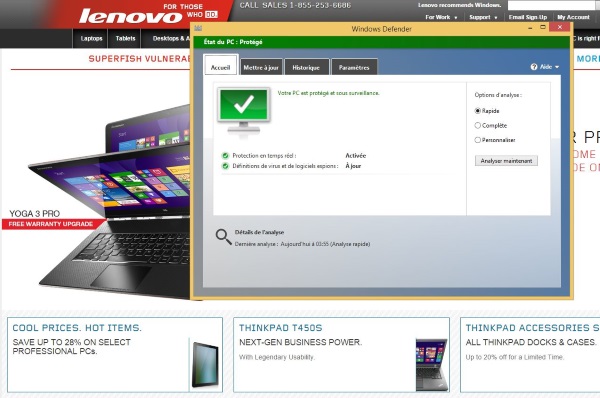 C’est plutôt Microsoft qui a pris la chose en mains en premier aujourd’hui, avec une mise à jour de son antivirus Windows Defender, qui permet de désinstaller Superfish, en plus de mettre à jour les certificats SSL de l’ordinateur. Il suffit donc de mettre à jour Windows Defender et d’analyser son appareil pour s’en débarrasser.