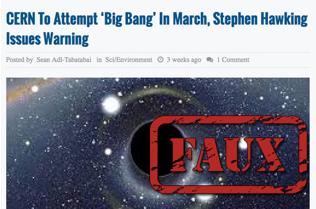 Il est important de voir d’où le site en question prend les déclarations de M. Hawking, puisqu’il serait extrêmement surprenant que ce dernier offre une entrevue exclusive à un site absolument inconnu. Le site prend son information ici (un site qui prétend que les expériences du CERN feront apparaître le dieu Shiva… ouais), qui prend son information de Fox News (c’est la dernière fois que l’inspecteur viral envoie un lien vers Fox News, il vous le jure).