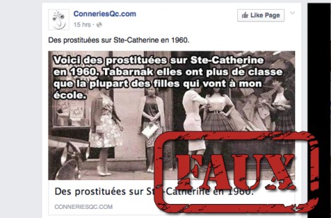 On nous montre une photo en noir et blanc de dames coquettes debout devant un hôtel. Or, scandale! On nous dit que ce sont en fait des prostituées sur la rue Sainte-Catherine à Montréal en 1960! «Tabarnak, elles ont plus de classe que la plupart des filles à mon école», nous dit-on.