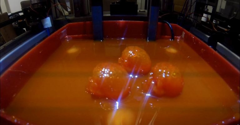 Les objets sont «imprimés» à partir de résine liquide, par couches successives de haut en bas, à l’inverse de ce qui se fait sur les imprimantes 3D classiques qui impriment de bas en haut.