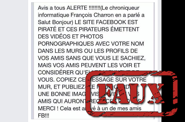 Celle qui suit nous apprend (en lettres majuscules, bien sûr) que le site Facebook a été «piraté», et que des pirates s’amusent à publier des photos pornographiques sur votre page à votre insu. Comble du malheur: vos amis peuvent voir ladite photo et penser que vous êtes un méchant pervers!