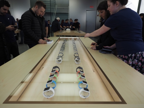 Je débarque à l’Apple Store Sainte-Catherine à Montréal un peu après midi le premier jour des commandes anticipées de l’Apple Watch. La boutique est pleine, sans être bondée. Ce qui frappe en fait, ce sont surtout les dizaines d’employés, dont six qui ne semblent présents que pour nous souhaiter bonjour à l’entrée.
