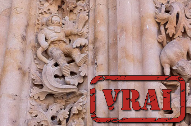 Bon, premièrement, la construction de la cathédrale en question, la Nouvelle cathédrale de Salamanque, a débuté en 1513. Donc elle a 502 ans, et non pas 900 ans. Mais cela n’explique pas la présence de notre cosmonaute de pierre.