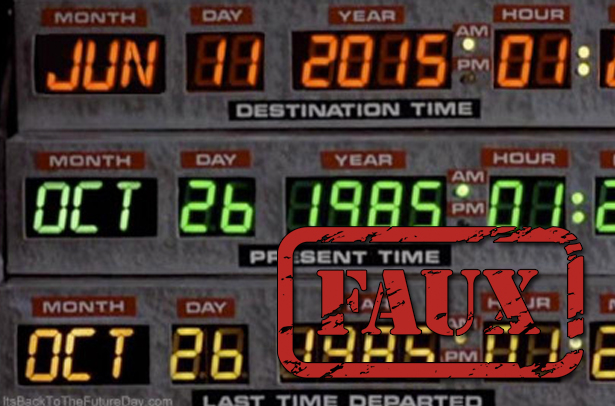 Depuis le début des années 10 (O… M… G…, on vit dans les années 10), des gens partagent des statuts Facebook du genre: «AYOYE!!!!! ON VIT DANS LE FUTUR!!! LOLLE!» On inclut généralement une capture d’écran du film Retour vers le futur, où on voit la date d’aujourd’hui inscrite sur le tableau indicateur de la DeLorean à voyager dans le temps. Un peu comme ceci: