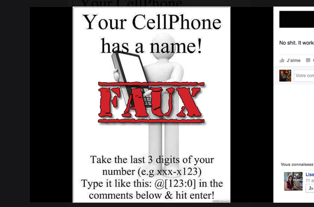 «Votre téléphone a un nom! Les trois derniers chiffres de votre numéro de téléphone (ex: xxx-x123). Écrivez le comme ceci: @[123:0] dans les commentaires et peser enter!» Peut-on lire.