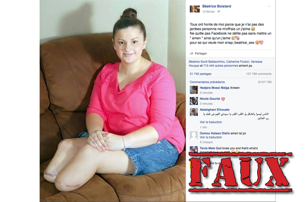 Cette page Facebook immensément populaire au nom de «Béatrice Boistard» (la publication ci-haut a plus de 715 000 j’aime et 22 000 partages, quand même) publie invariablement des images de femmes vivant avec un handicap, appelant les internautes à cliquer J’aime avec des commentaires comme «personne ne m’aime» ou «tous ont honte de moi».