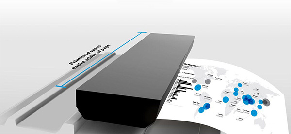 Contrairement aux imprimantes à jet d’encre où une tête d’impression effectue des vas et viens sur la page à vive allure, les imprimantes PageWide sont dotées d’un module fixe, qui imprime sur toute la largeur d’une feuille d’un seul coup à l’aide de 40 000 petits jets d’encre.