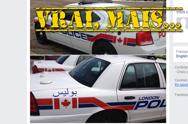 «Regardez l’écriture sur la voiture de police. C’EST COMME ÇA QUE ÇA COMMENCE, LA PORTE EST DÉJÀ ENTROUVERTE. Qu’en pensez-vous? L’ONTARIO NOUS APPARTIENT! Pourquoi est-ce acceptable? Qui l’a autorisé ???????????? Même pas d’écriture en français» peut-on lire dans la publication, qui comprend deux photos d’une voiture de police de la ville de London, en Ontario, où on peut voir de l’écriture arabe.