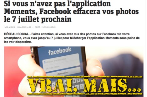 Plusieurs articles et publications Facebook circulent depuis une semaine, affirmant que Facebook effacera toutes vos photos d’ici le 7 juillet si vous ne téléchargez pas sa nouvelle application, Moments.