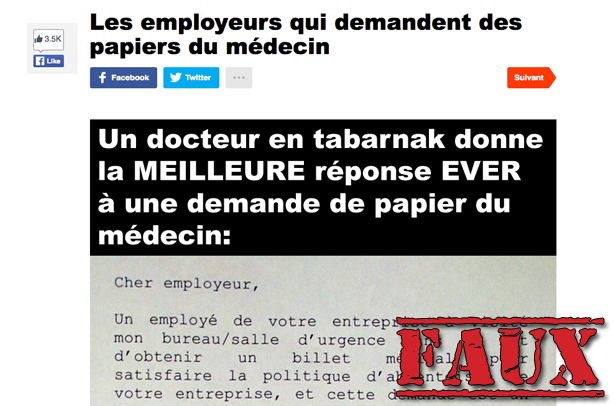 La morale de l’histoire: plutôt que de fausser un billet du médecin, pourquoi ne pas fausser une lettre dudit médecin qui menace votre employeur de lui facturer 30$?