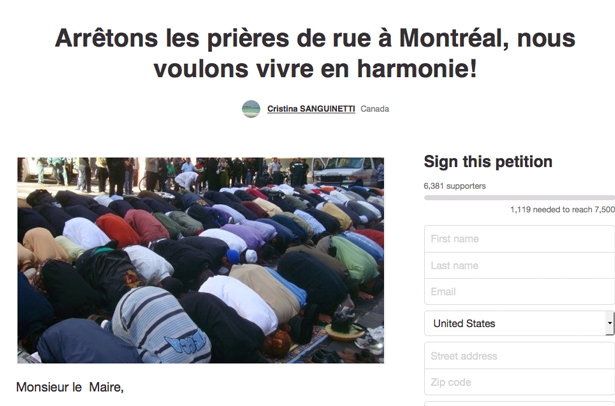 Dans cette pétition, qui a recueilli près de 6900 signatures, on s’insurge contre un événement ayant eu lieu à Montréal le 7 juin. On affirme qu’il y a eu une «prière de rue» où on «appelait tout le monde à la prière et on récitait des versets coraniques en arabe».