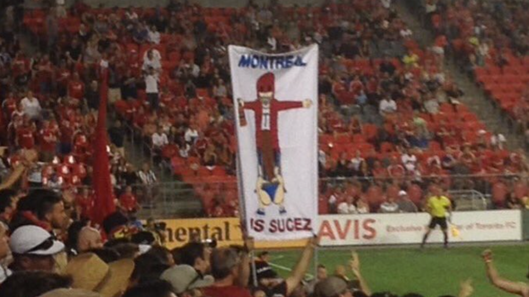 Sur la banderole tenue par des partisans de l’équipe torontoise, on peut lire «Montréal vous sucez» et on y voit un dessin d’une femme accroupie devant un homme habillé aux couleurs du Toronto FC.