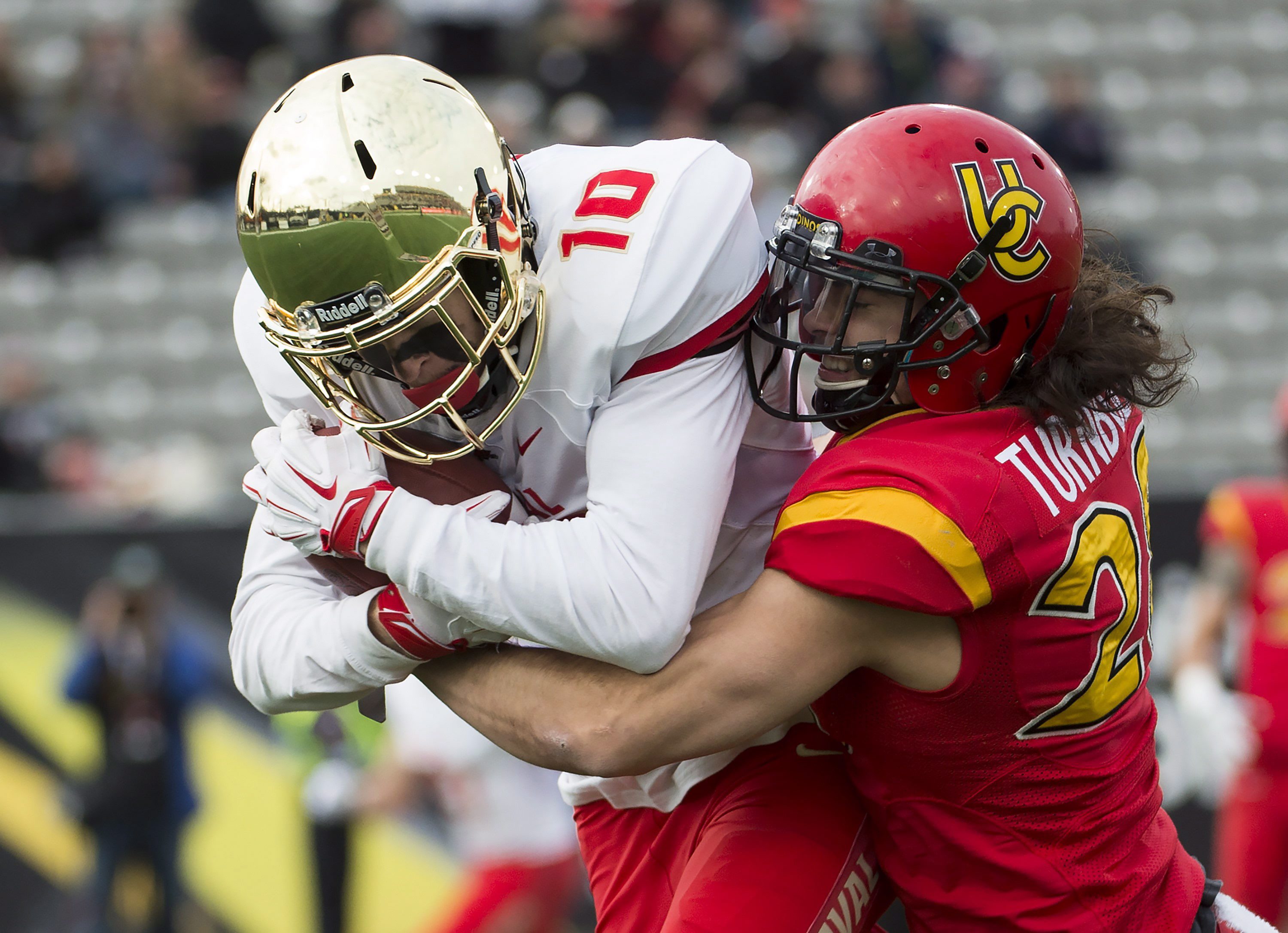 Laval Rouge et Or Marc-Antoine Pivin (10) scores a touch down despite pressure from Calgary Dinos' Hunter Turnbull (28) during first half U Sports Vanier Cup championship football action, in Hamilton, Ont., on Saturday, November 26, 2016. THE CANADIAN PRESS/Nathan Denette
