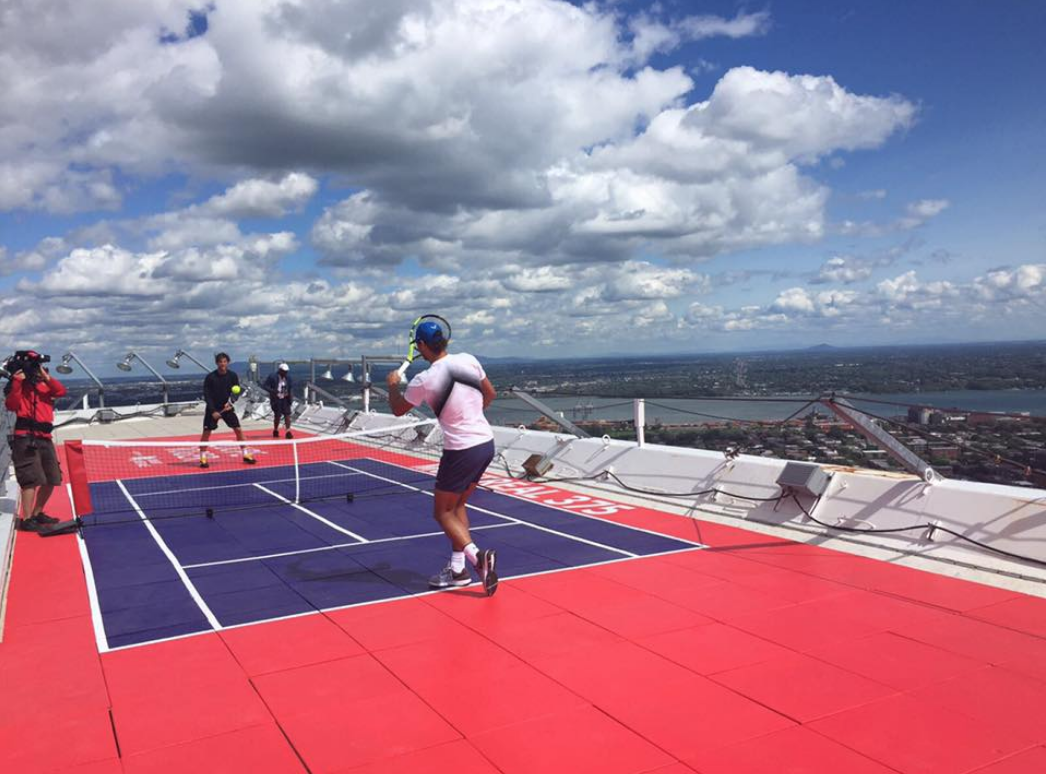 L’Espagnol Rafael Nadal et l’Autrichien Dominic Thiem ont profité de la journée de dimanche pour se préparer en vue de leurs matchs de premier de la Coupe Rogers. Par contre, ils n’ont pas choisi le terrain le plus traditionnel pour le faire, alors qu’il ont joué un match de mini-tennis au sommet de la tour du Stade olympique.