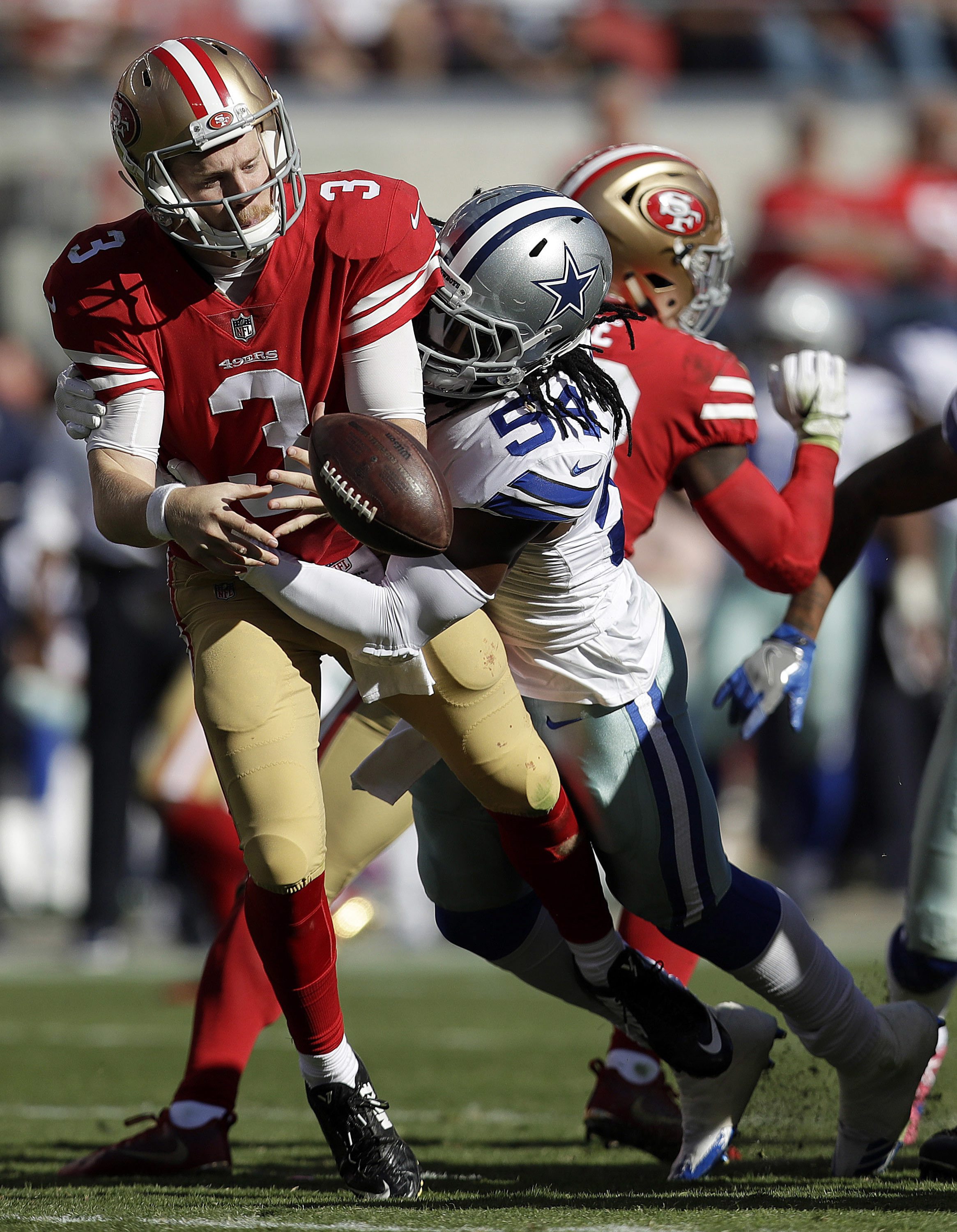Beathard a complété 22 de ses 37 tentatives de passe pour 235 verges de gains, mais son échappé à la suite d’un sac de DeMarcus Lawrence en fin de première demie a mis un terme à une possession prometteuse qui a permis aux Niners d’atteindre le 5 des visiteurs.
