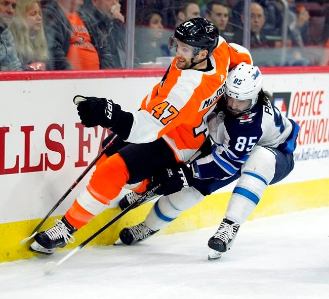 PHILADELPHIE — Claude Giroux et Andrew MacDonald ont touché la cible en deuxième période et les Flyers de Philadelphie ont fait fi du 40e but de Patrik Laine cette saison afin de venir à bout des Jets de Winnipeg par la marque de 2-1, samedi.