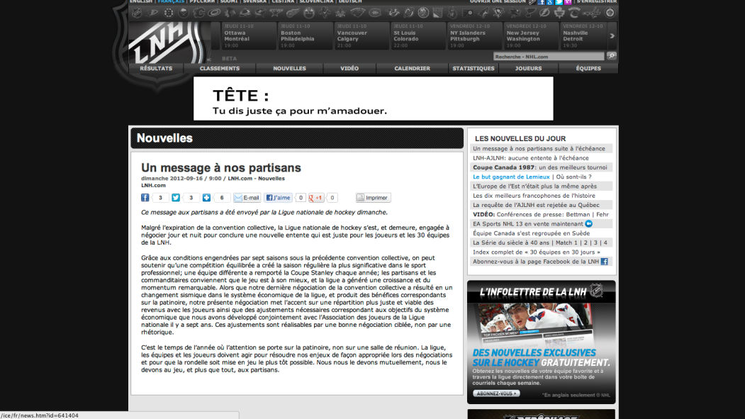 Si la LNH a fait une traduction boîteuse de son message aux amateurs francophones, l’AJLNH a totalement négligé la clientèle francophone. On a raté une belle occasion d’inclure à tous le moins des extraits du Franco-Manitobain Toews.