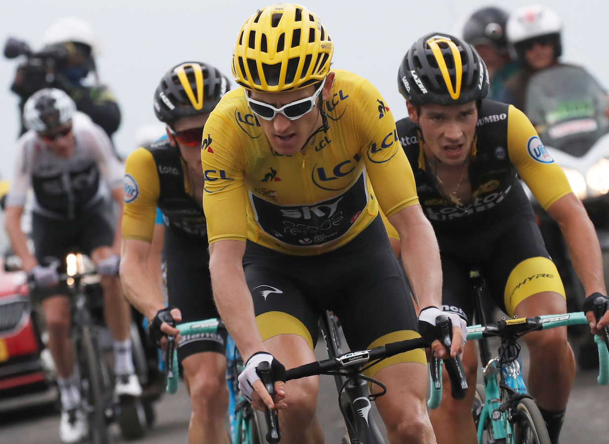 Froome était alors vêtu d’un imperméable noir par-dessus son uniforme, quelques instants après avoir craqué pendant l’ascension finale du Col du Portet, réduisant de façon drastique ses chances de l’emporter.