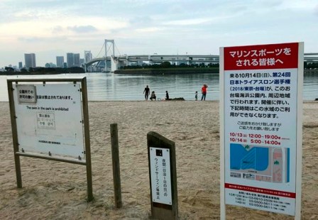 La baignade est interdite au parc marin d’Odaiba, situé au pied du Rainbow Bridge. Nakamura mentionne que c’est dû à l’absence de sauveteurs et non à cause de la pollution de l’eau.