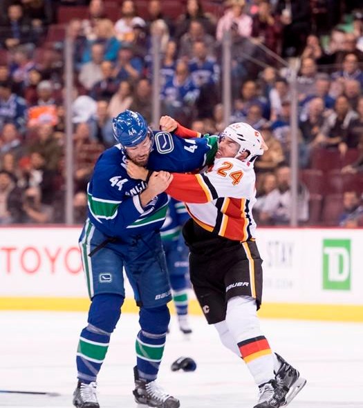 Hamonic s’est battu avec Erik Gudbranson des Canucks mercredi à Vancouver, où les Flames ont amorcé la saison régulière en s’inclinant 5-2.