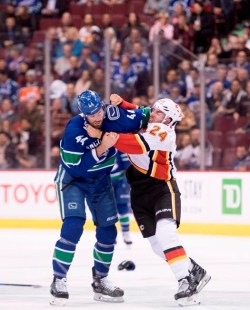Hamonic s’est battu avec Erik Gudbranson des Canucks mercredi à Vancouver, où les Flames ont amorcé la saison régulière en s’inclinant 5-2.