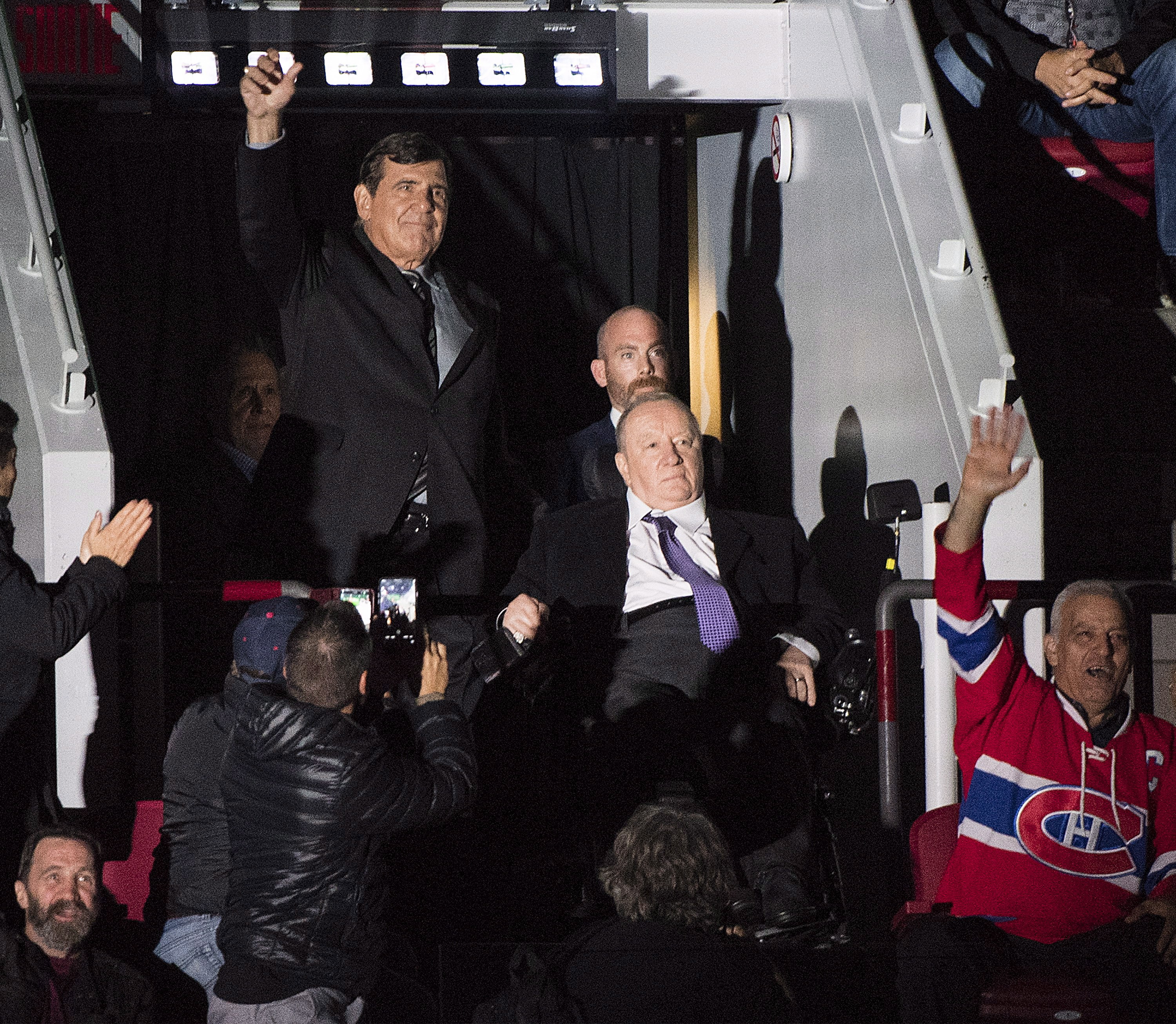 L’ancien joueur du Bleu‐blanc‐rouge et ex‐directeur général de la franchise victorieuse de 1993, Serge Savard, était à ses cotés lors de cette ovation qui a duré de longues secondes, dans un Centre Bell plein à craquer pour l’ouverture locale de la saison du CH.