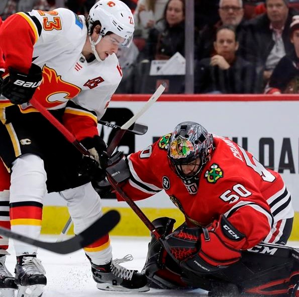 Mike Smith a repoussé 22 rondelles devant la cage des Flames alors que Corey Crawford a bloqué 38 tirs du côté des Blackhawks.