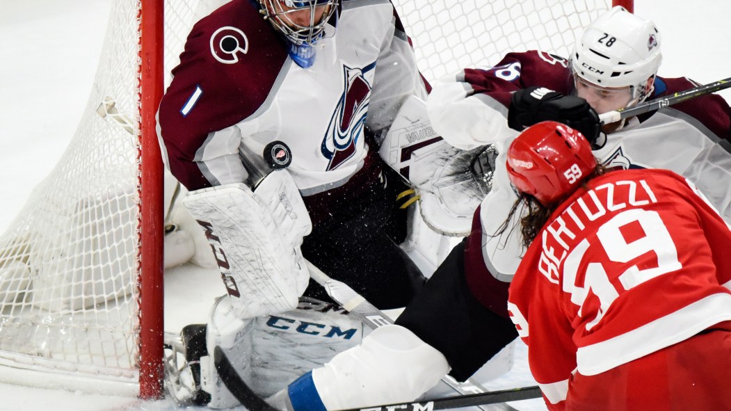 Colorado Avalanche goaltender Semyon Varlamov (1) of Russia blocks the shot of Detroit Red Wings left wing Tyler Bertuzzi (59) as defenseman Ian Cole (28) slides in during the third period of an NHL hockey game in Detroit, Sunday, Dec. 2, 2018. The Avalanche defeated the Red Wings 2-0. (AP Photo/Jose Juarez) Photo: Jose Juarez/AP
