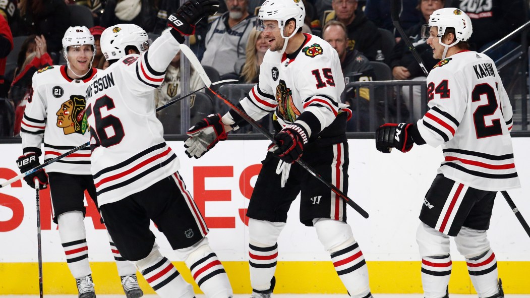 Chicago Blackhawks center Artem Anisimov (15) celebrates after scoring against the Vegas Golden Knights during the third period of an NHL hockey game Thursday, Dec. 6, 2018, in Las Vegas. (AP Photo/John Locher) Photo: The Associated Press