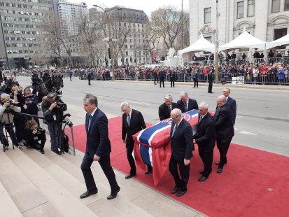 La cérémonie a débuté à 11h. Vers 12h45, un chasseur CF-18 de l’Aviation royale canadienne a effectué un survol au-dessus de la cathédrale lors de la sortie du cortège funèbre.