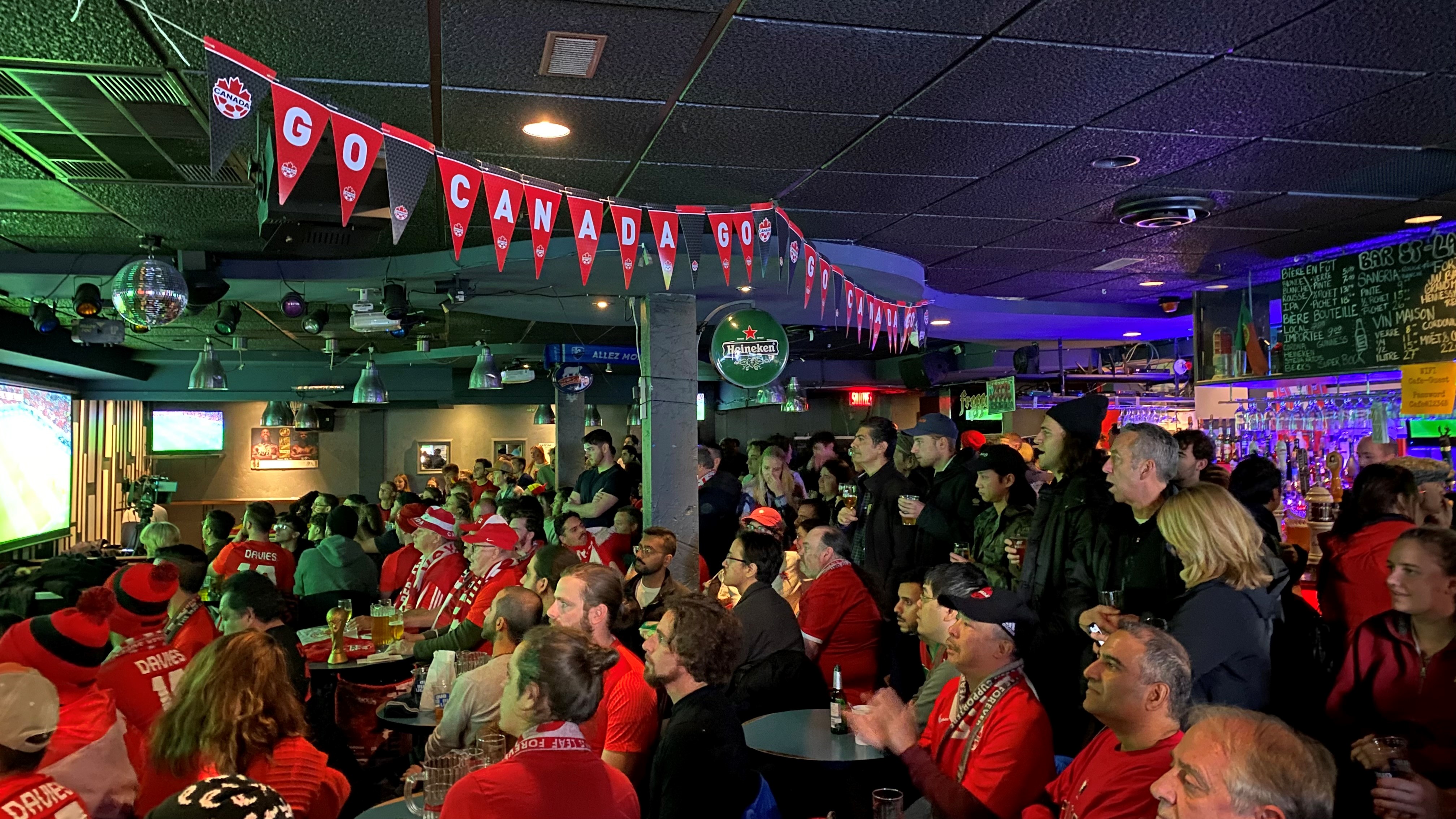 Des centaines de Montréalais tout de rouge vêtus se sont rassemblés cet après-midi au Café bar Frappé pour assister au grand retour du Canada à la Coupe du monde de soccer, après une absence de 36 ans.