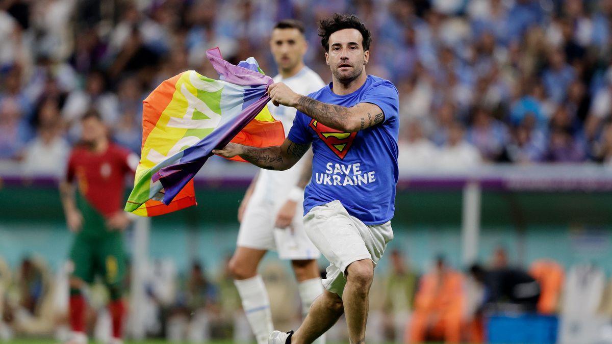 Le match de lundi opposant le Portugal à l’Uruguay a été interrompu durant quelques secondes, à la 51e minute de jeu. C’est qu’un partisan a déjoué les gardes de sécurité pour envahir la pelouse du stade de Lusail en brandissant un drapeau arc-en-ciel, dénonçant les droits bafoués de la communauté LGBTQ+ au Qatar. Le partisan en question portait également un chandail avec les inscriptions «Respect envers les Iraniennes» et «Sauvons l’Ukraine».