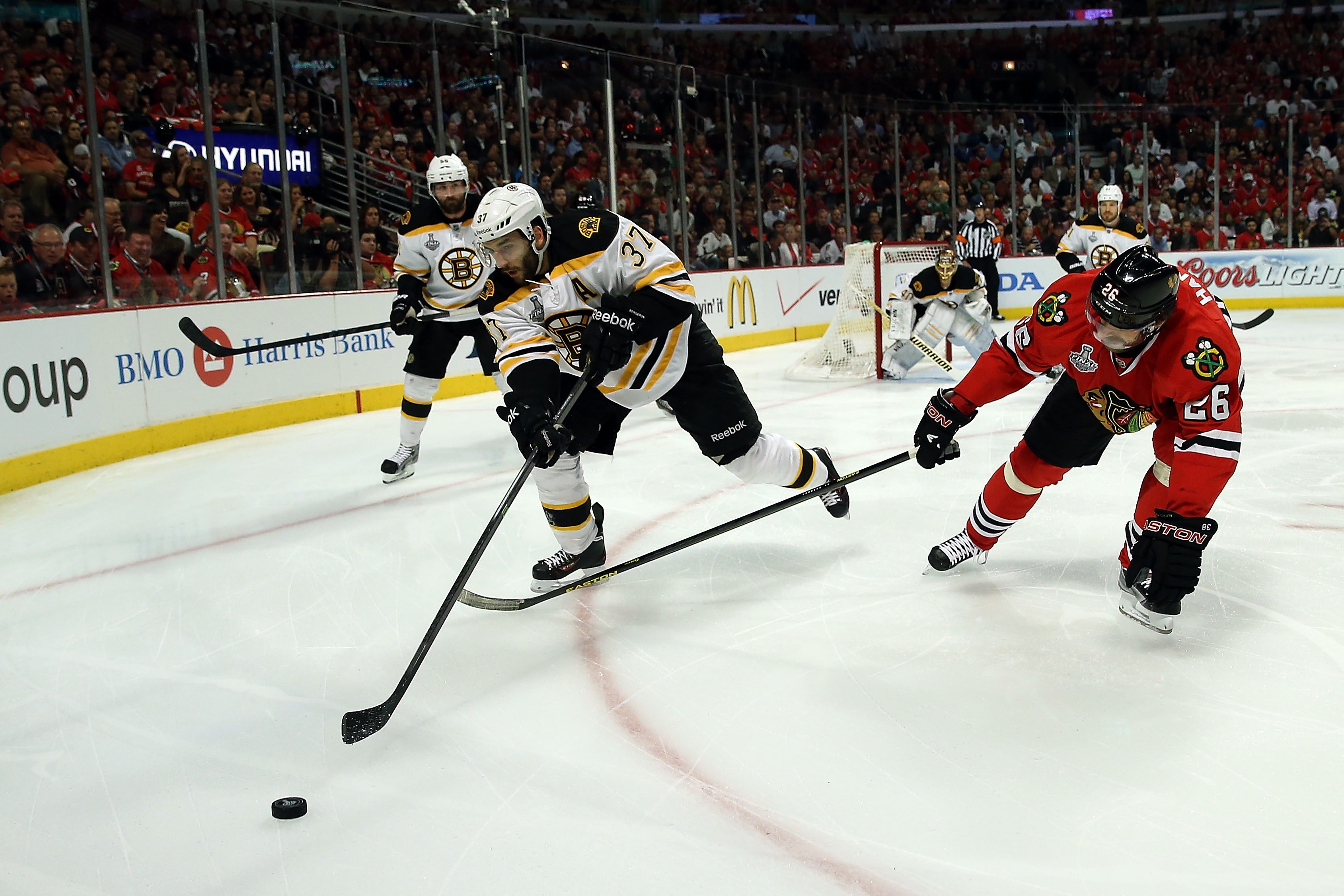 Patrice Bergeron a marqué l’autre but des Bruins tandis que Brandon Saad a fait mouche le premier pour les Blackhawks.
