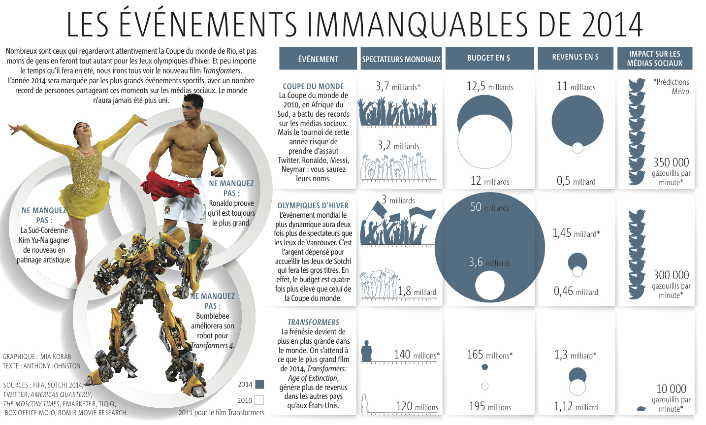 Nombreux sont ceux qui regarderont attentivement la Coupe du monde de Rio, et pas moins de gens en feront tout autant pour les Jeux olympiques d’hiver. Et peu importe le temps qu’il fera en été, nous irons tous voir le nouveau film Transformers. L’année 2014 sera marquée par les plus grands événements sportifs, avec un nombre record de personnes partageant ces moments sur les médias sociaux. Le monde n’aura jamais été plus uni.