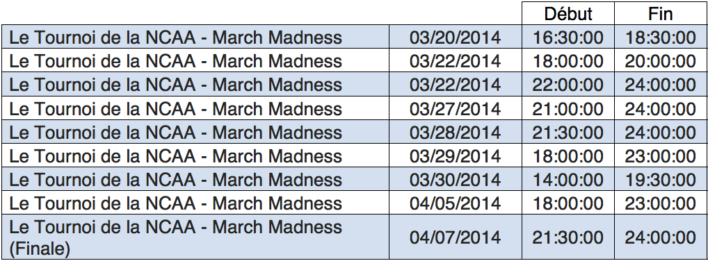 De plus, il est possible de suivre le tournoi en français. Voici la programmation de RDS (tous les matchs seront présentés sur RDS2) pour la durée du March Madness.