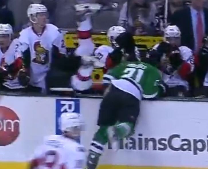 2. Milan Michalek des Sénateurs peut dire merci à Antoine Roussel des Stars qui lui permet d’effectuer un changement en lui payant une petite virée au banc des joueurs. Michalek se relève, s’assoit et il est content!