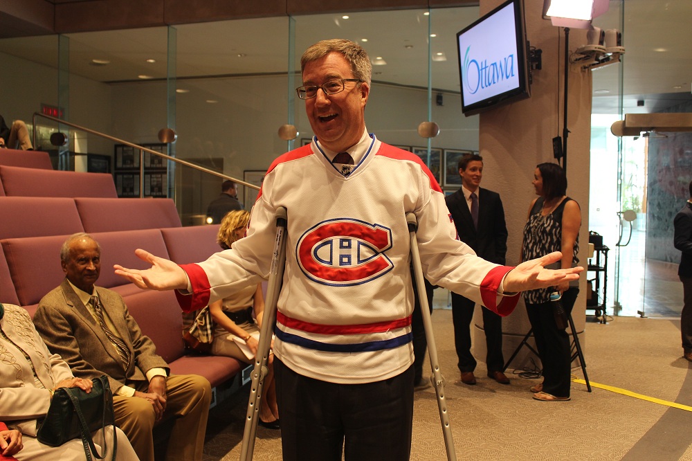Le maire d’Ottawa a rempli son pari, hier matin, et a porté le gilet du bleu-blanc-rouge lors de la séance du conseil municipal.