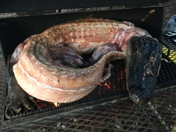 LSU affronte les Gators de l’Université de Floride ce soir. Vous aurez donc compris que les partisans de LSU ont décidé de faire cuire et déguster leur adversaire, un alligator, en vue du match.