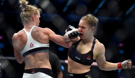 Holm a complètement dominé le premier round en atteignant Rousey au visage à plusieurs occasions et a complété le travail au deuxième engagement avec un puissant coup de jambe au cou.