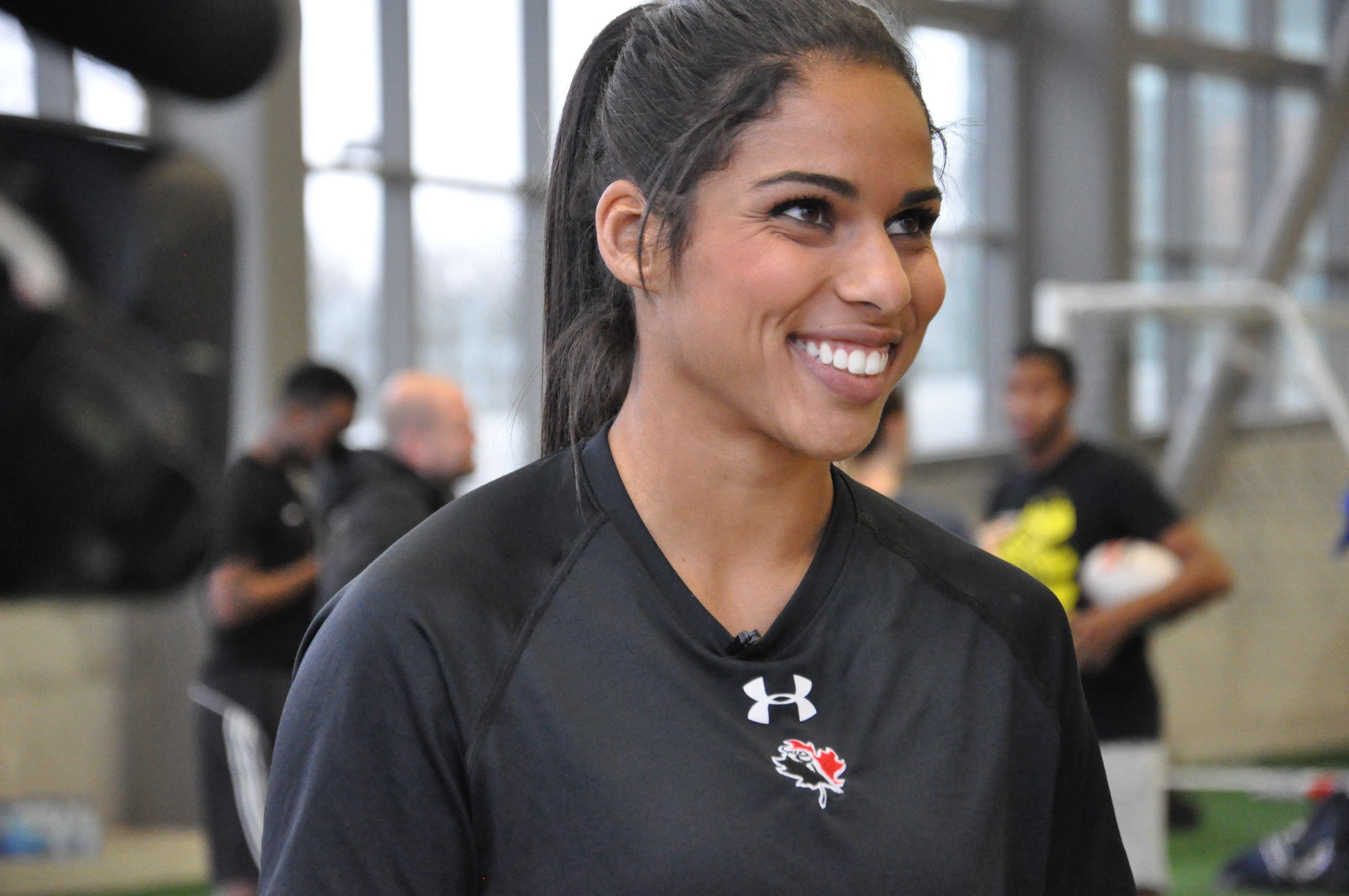 La Québécoise de 24 ans est actuellement en préparation pour les Jeux de Rio pour le baptême olympique de la sélection nationale de rugby à 7. En attendant, pourquoi ne pas faire une escale à Montréal afin de donner un cours 101 à des sportifs et journalistes courageux? Petite séance de rugby avec l’une des meilleures joueuses au pays.