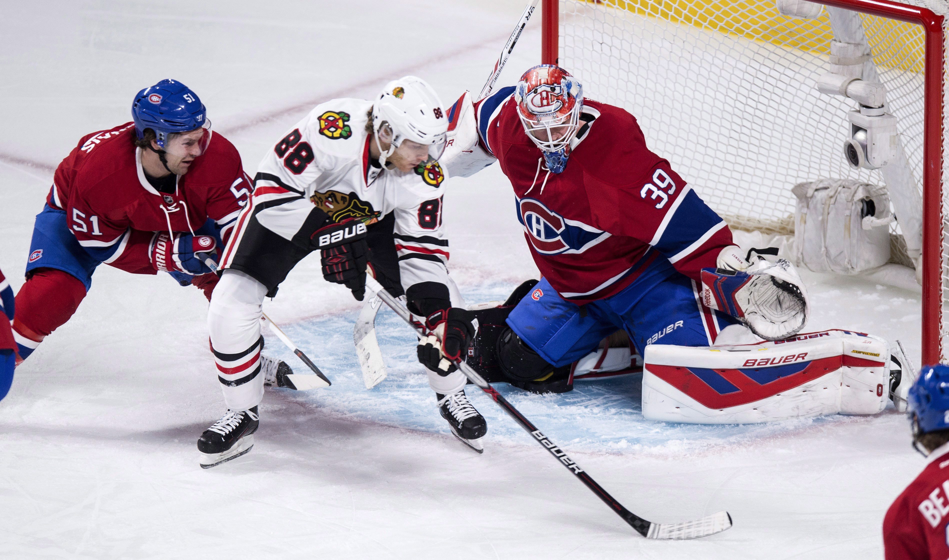 Le gardien des Blackhawks a repoussé 39 des 40 tirs du Canadien hier. Il s’est particulièrement illustré sur un lancer dévié par Brendan Gallagher en troisième période.