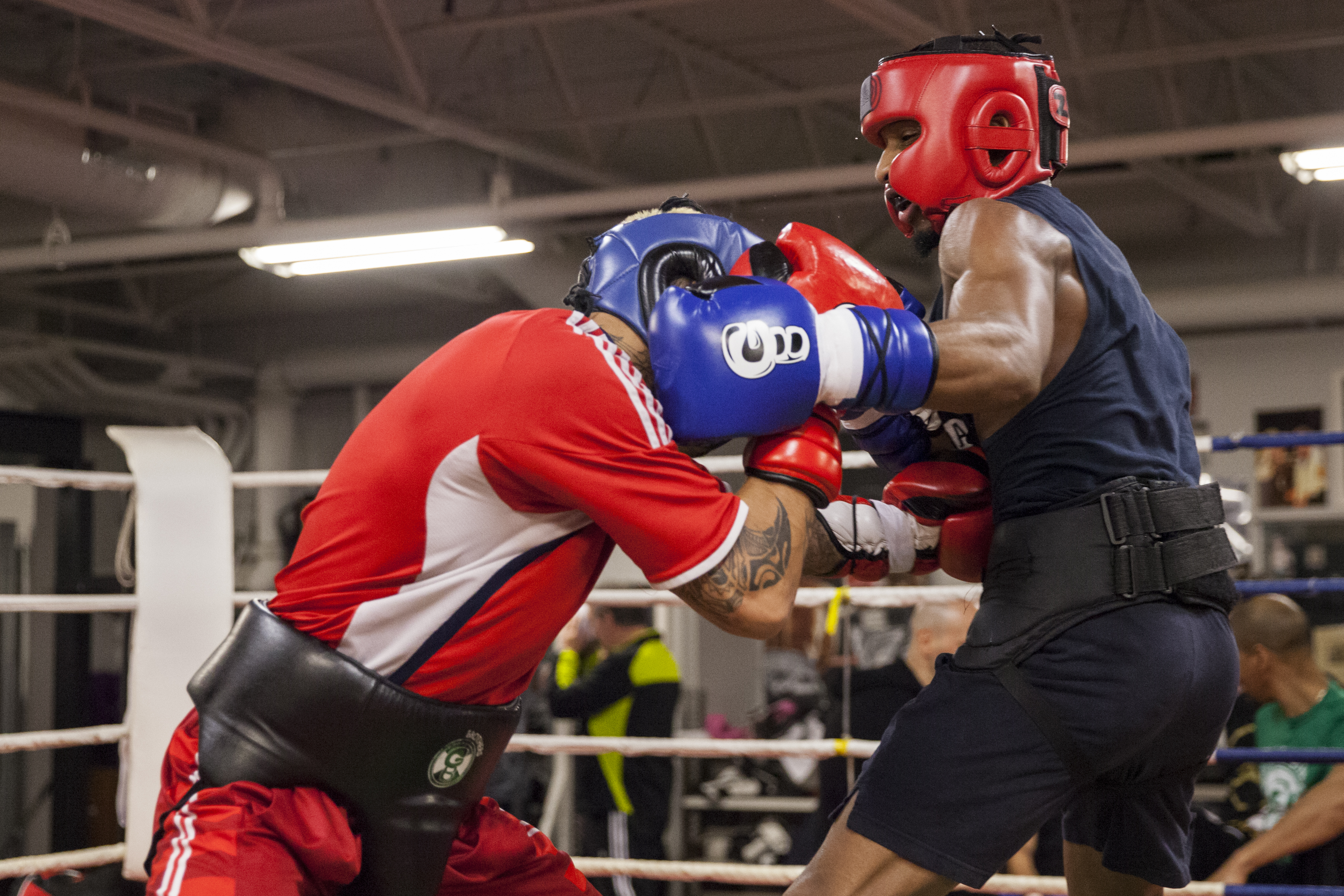 À l’approche du ring, la testostérone des boxeurs est palpable. Les uns appliquent du ruban sur leurs mains, les autres enfilent casques et protecteurs buccaux. L’air à l’intérieur du gym s’emplit de fébrilité et un subtil sourire s’affiche sur le visage d’Howard Grant, ancien pugiliste professionnel devenu entraîneur.