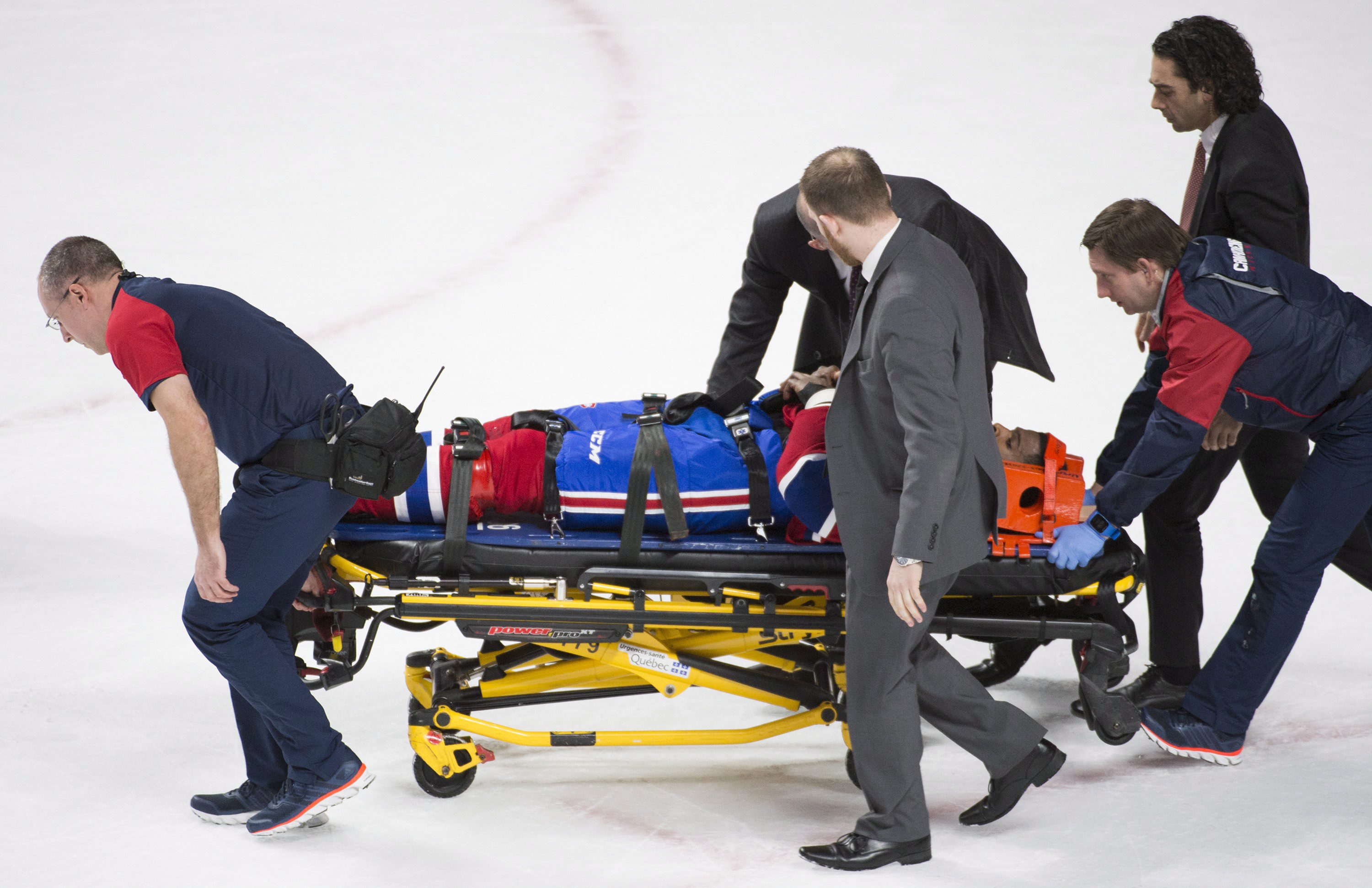 Le joueur-vedette du Canadien de Montréal P.K. Subban a quitté la glace du Centre Bell sur une civière jeudi soir après un contact avec son propre coéquipier Alexei Emelin.