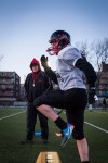 Dans le petit vestiaire de l’école Dalbé-Viau de Lachine se prépare la seule équipe de football compétitif féminin du Québec, le Blitz de Montréal.