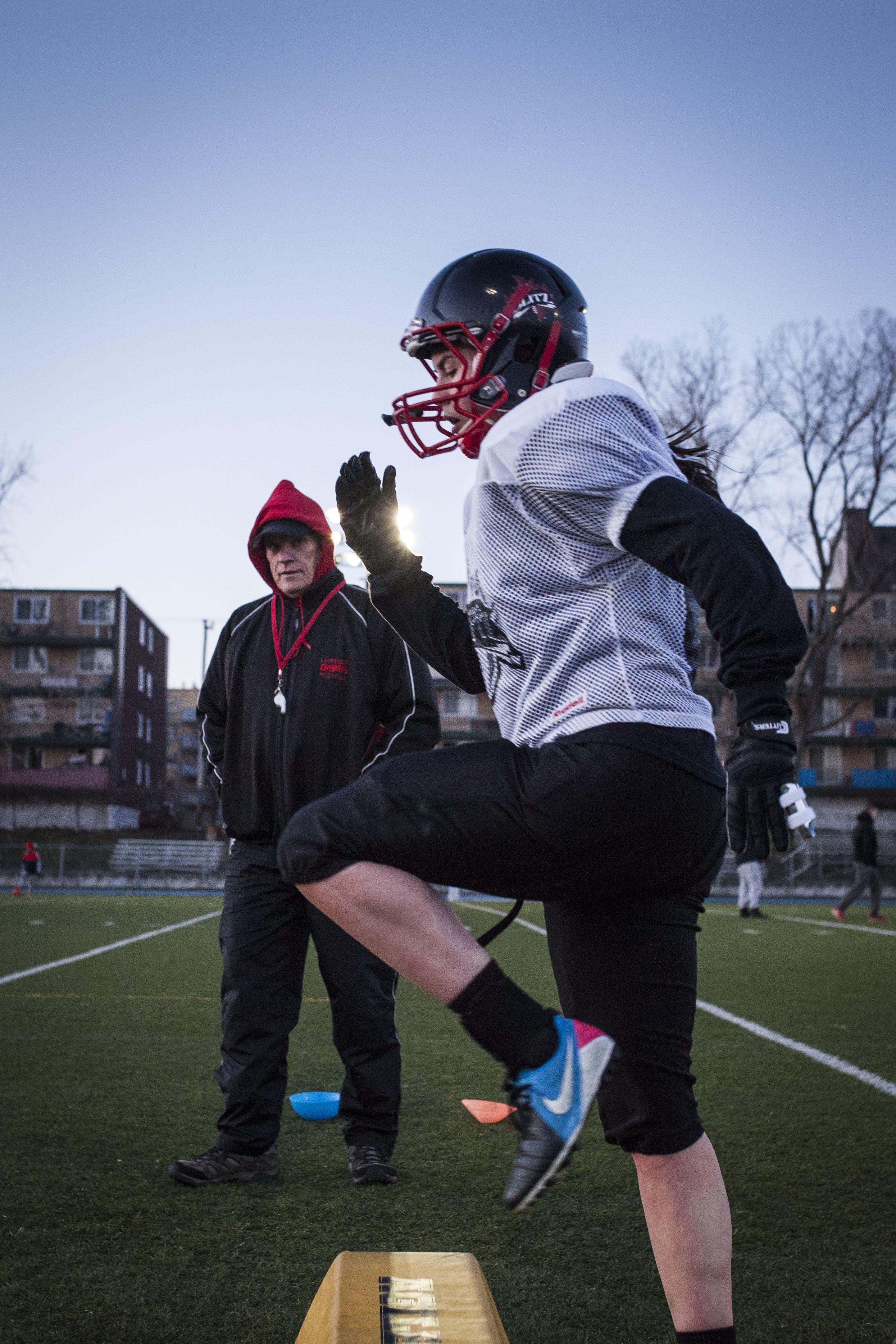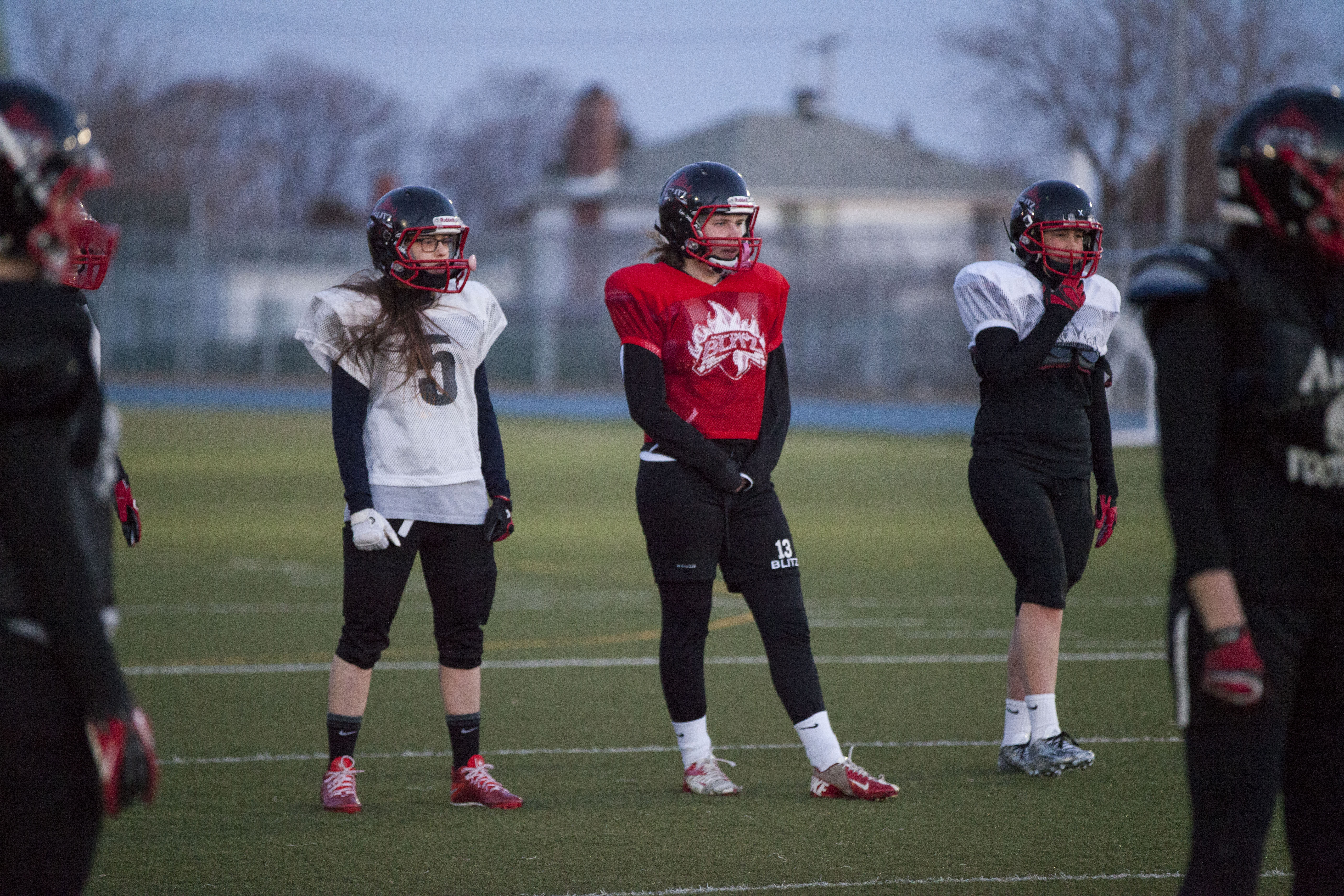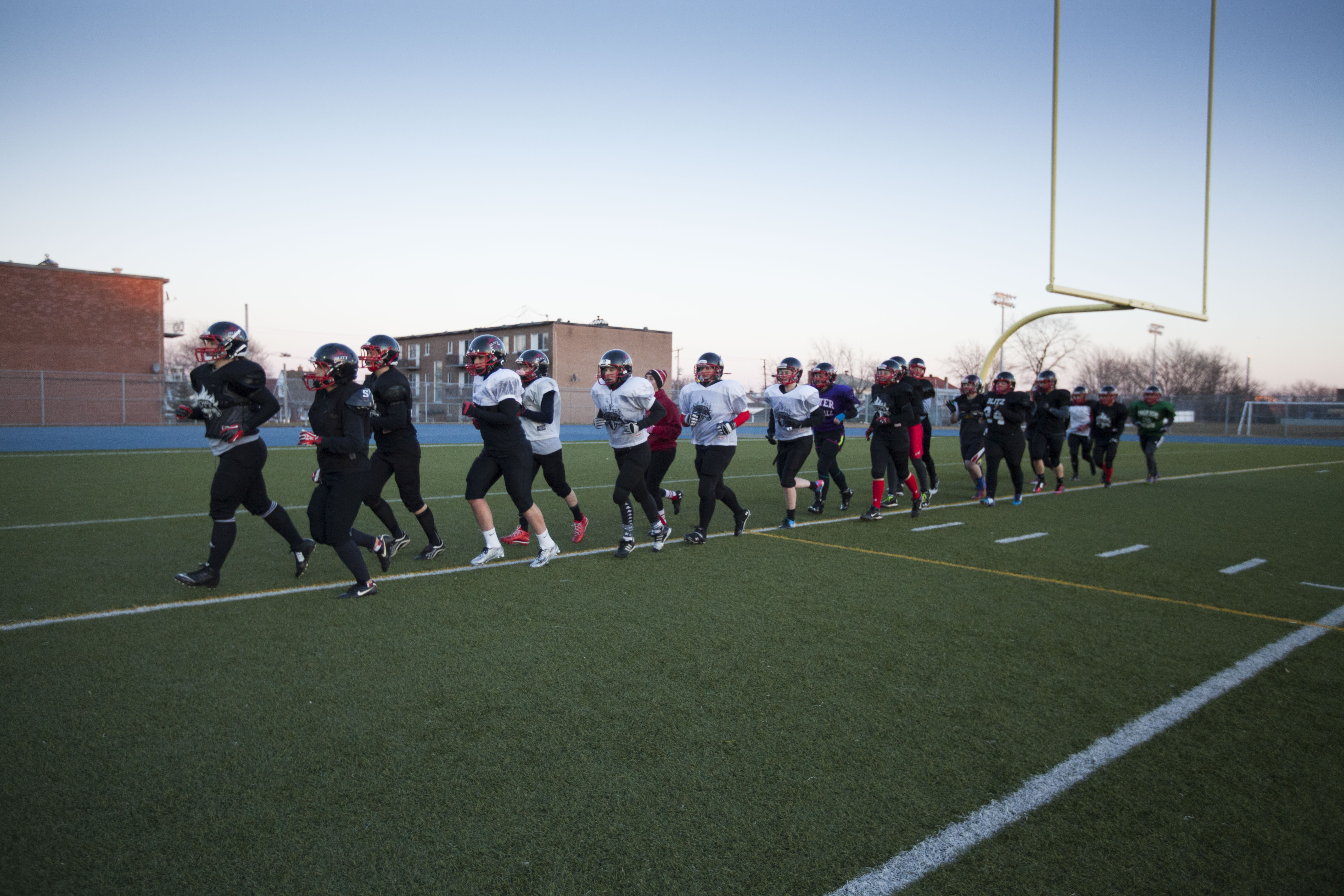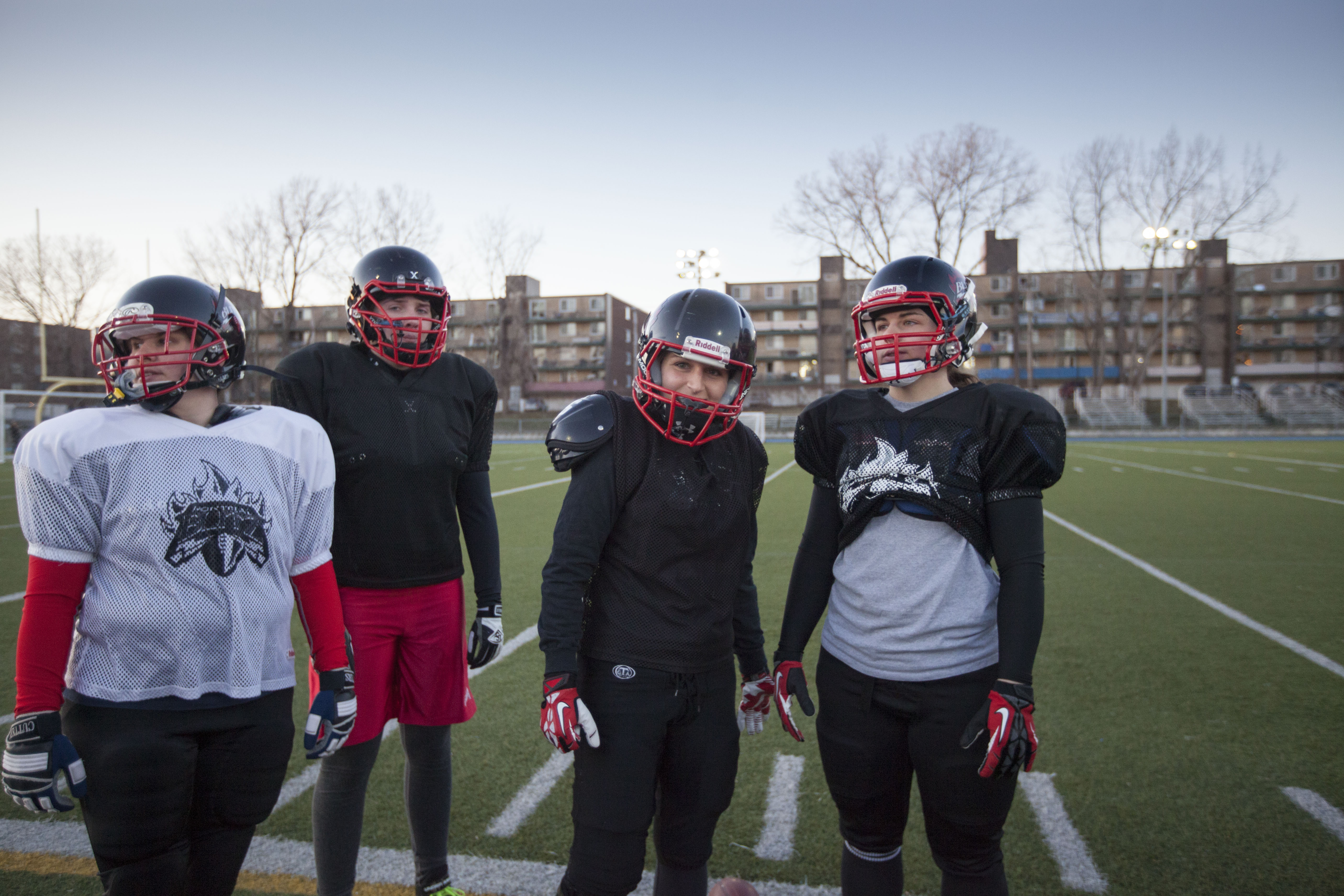 Dans le petit vestiaire de l’école Dalbé-Viau de Lachine se prépare la seule équipe de football compétitif féminin du Québec, le Blitz de Montréal.