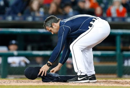 Après avoir dit sa façon de penser à l’officiel, et après avoir été expulsé du match, Ausmus a recouvert le marbre avec son chandail pour… euuuuh… la raison n’est pas tout à fait clair. Peut-être pour aider l’arbitre à le trouver?