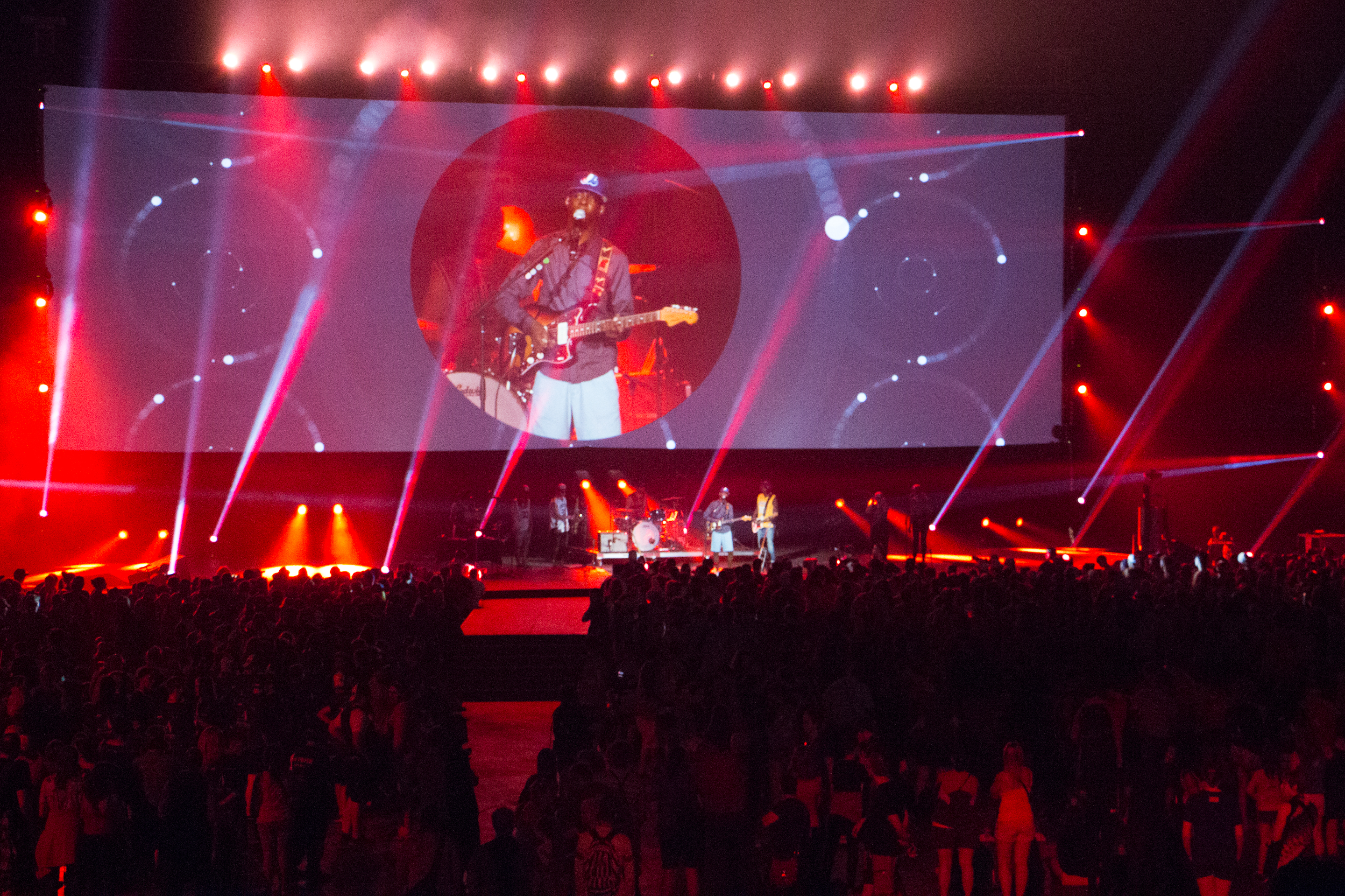 Le chanteur Karim Ouellet est monté sur la scène du stade olympique afin de chanter quelques-uns de ses succès devant les délégations de toutes les régions du Québec. Les membres du groupe de l’artiste originaire de Québec étaient tous coiffés de casquettes à l’effigie de l’équipe de baseball des Expos.
