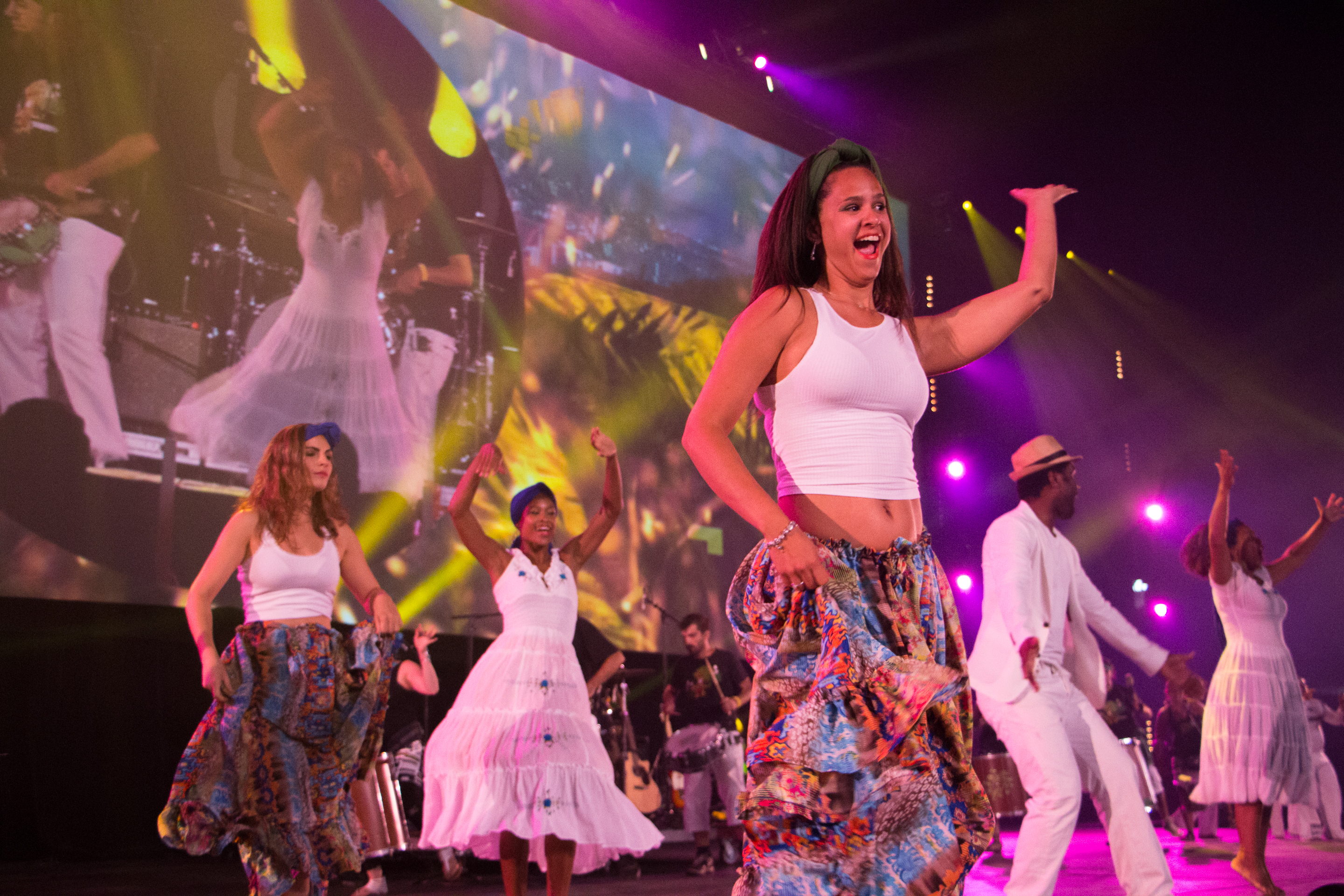 Le chanteur Karim Ouellet est monté sur la scène du stade olympique afin de chanter quelques-uns de ses succès devant les délégations de toutes les régions du Québec. Les membres du groupe de l’artiste originaire de Québec étaient tous coiffés de casquettes à l’effigie de l’équipe de baseball des Expos.