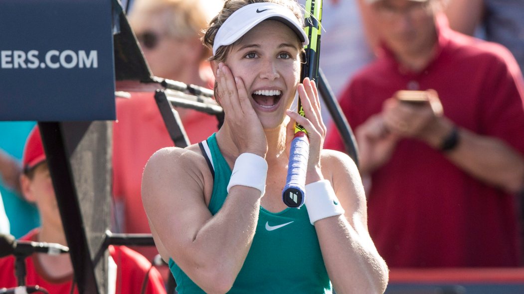 Canada's Eugenie Bouchard reacts after beating Lucie Safarova of the Czech Republic during first round of play at the Rogers Cup tennis tournament Tuesday July 26, 2016 in Montreal. THE CANADIAN PRESS/Paul Chiasson Photo: Paul Chiasson/THE CANADIAN PRESS