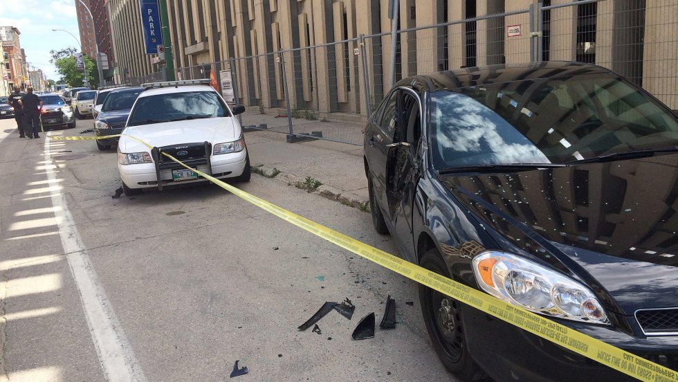 WINNIPEG – Un camion en mouvement s’est précipité sur cinq voitures de police stationnées tout près du quartier général de la police de Winnipeg lundi matin, ont affirmé les policiers.